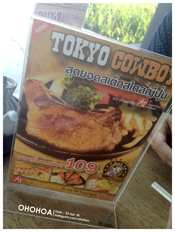 มีโฆษณาตั้งที่โต๊ะว่าสเต็กสไตล์ญี่ปุ่น เริ่มต้นที่ 109.-
