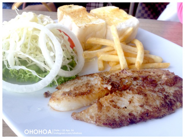 เสิร์ฟพร้อมขนมปังกระเทียม สลัด และเฟร้นฟราย เนื้อปลาดูภายนอกแล้วออกจะเกรียมหน่อยๆ