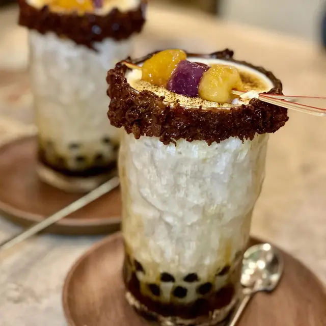 4️⃣ 脆脆黑糖瀑布珍珠奶茶$44: 杯邊嘅朱古力脆脆好好食😋飲落去奶味好滑,黑糖珍珠都好多,最特別係上面芋圓💕